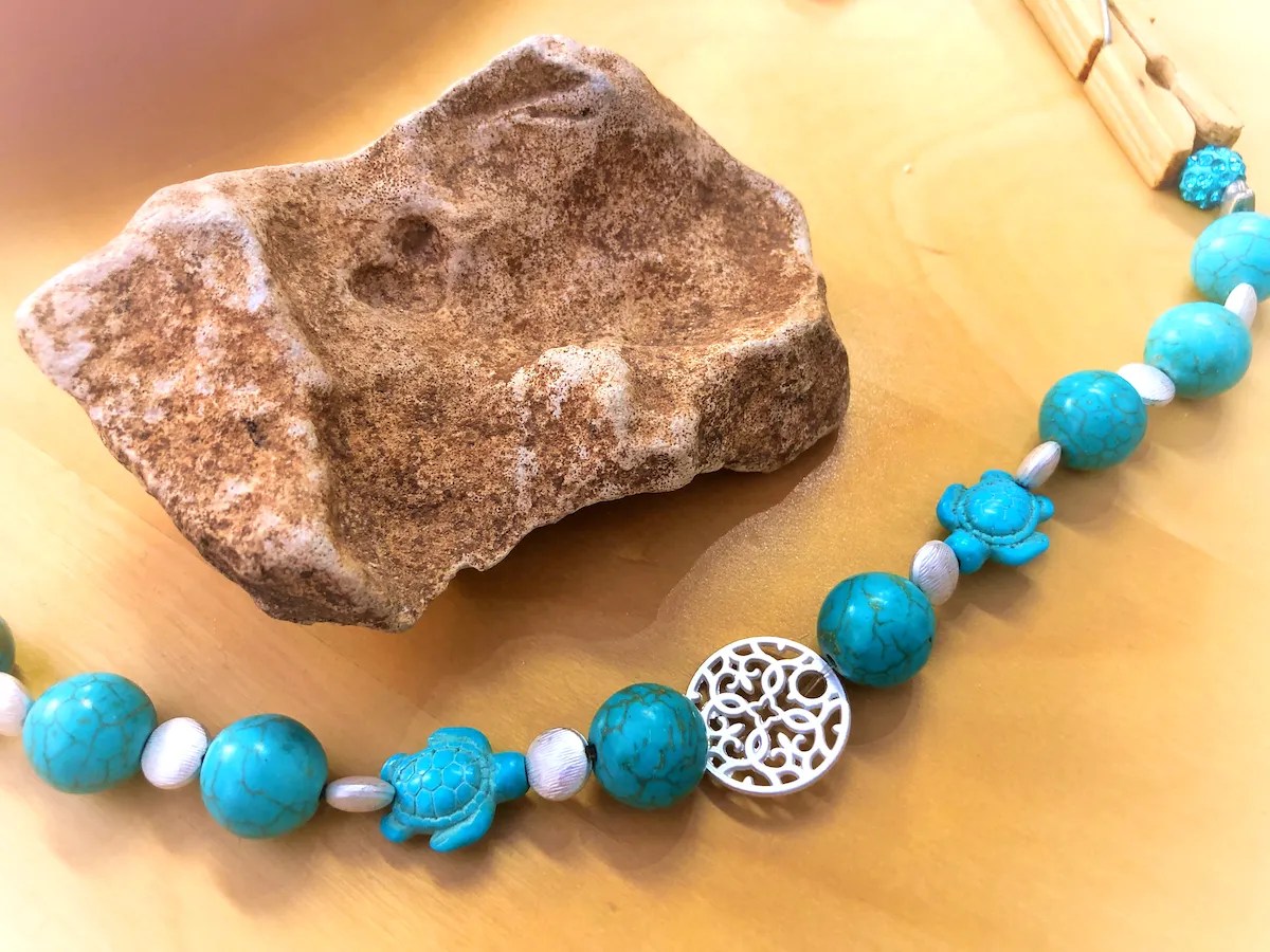 Ins Armband arbeite ich zwei türkisfarbene Wasserschildkröten ein, die auf ein filigranes Silberstück zuschwimmen. Die grüntürkisen Perlen ziert ein marmoriertes Muster, das sie an kleine Erdkugeln erinnern läßt. Zwischen ihnen schimmern mattsilberne flache Perlen, die das Licht sanft reflektieren. Als besonderer Abschluss glitzert eine funkelnde Perle, die mir Annett freudestrahlend reichte. Um dieses Funkelstück herum vervollständigen zwei kleine Perlen, die an Seesterne erinnern, mein Design des Armbands.