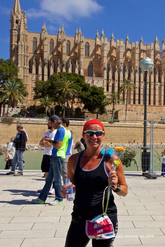 Die Kathedrale La Seu mal nur als Statistin – Heike ist der Star heute. Und glücklich nach dem Lauf mit der Finisher Blume.
